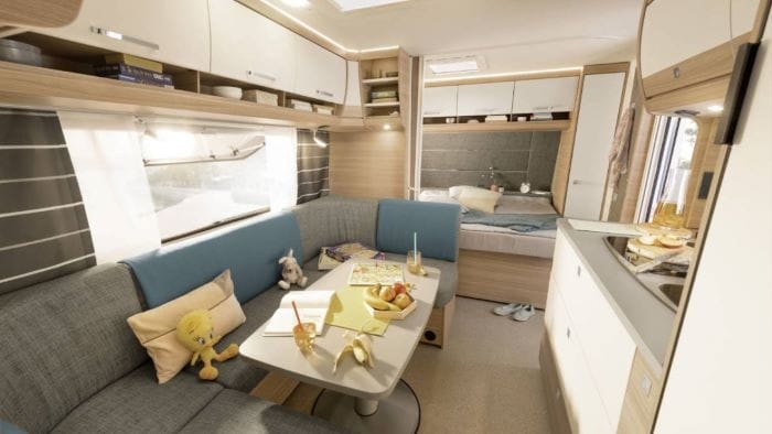 En esta ocasión, podemos ver el interior de una furgoneta al estilo clásico, con su cama al fondo, el sofá gris con una mesa fija al suelo y una mini cocina en frente. Está llena de maleteros en la parte superior, que viene muy bien para guardar cosas, y tanto éstos como los muebles de la cocina son blancos y los rebordes son de madera. Las cortinas tipo estor son blancas y marrones con rayas claras. Este espacio está muy bien aprovechado y no le falta de nada.