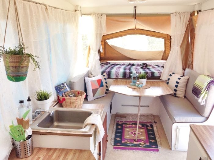 Esta furgoneta camperizada sigue teniendo los colores cálidos y claros pero el dueño, los alterna con el color morado o lila. La mesa que está entre los sofás está anclada al suelo, hay una alfombra morada y rosa y los cojines, aunque no tienen el mismo dibujo, están dentro del mismo estilo. Al fondo vemos la cama en horizontal, como es común para aprovechar el espacio, con una manta acorde el estilo de la decoración de la furgoneta. Vemos que las cortinas claras se pueden recoger con unas tiras o estirar creando un espacio de intimidad. Dispone de grifo y fregadero convencional, y hay varias macetas (una de ellas colgada) en el espacio para transmitir un lugar más hogareño. Nos recuerda un poco a una decoración azteca.
