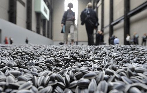 Después de esta impresionante obra el afán por exponer del Ai Weiwei fue en aumento. En 2010 realizó una de las exposiciones más famosas que se recuerdan. Con el trabajo de 1600 artesanos de la ciudad de Jingdezhen, una disciplina y paciencia sólo propia del mundo oriental, consiguió llenar la sala de turbinas del museo Tate Modern de Londres con cien millones de pequeñas pipas de porcelana hechas y decoradas a mano. Su obra Sunflower sedds fue admirada por los críticos como esa unión entre el minucioso trabajo tradicional y el nuevo fenómeno económico reflejado en su mayor producto de exportación. Una obra que podía tocarse, sentirse y escuchare, una obra viva, con una, no muy escondida, critica social y política.