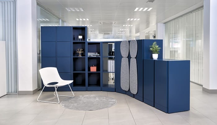 Su modulación sinuosa y sus complementos funcionales fusionan y optimizan diferentes usos: del almacenaje a la delimitación de espacios y la configuración de puestos de trabajo individuales y colectivos, sin necesidad de trabajos de obra ni de albañilería.