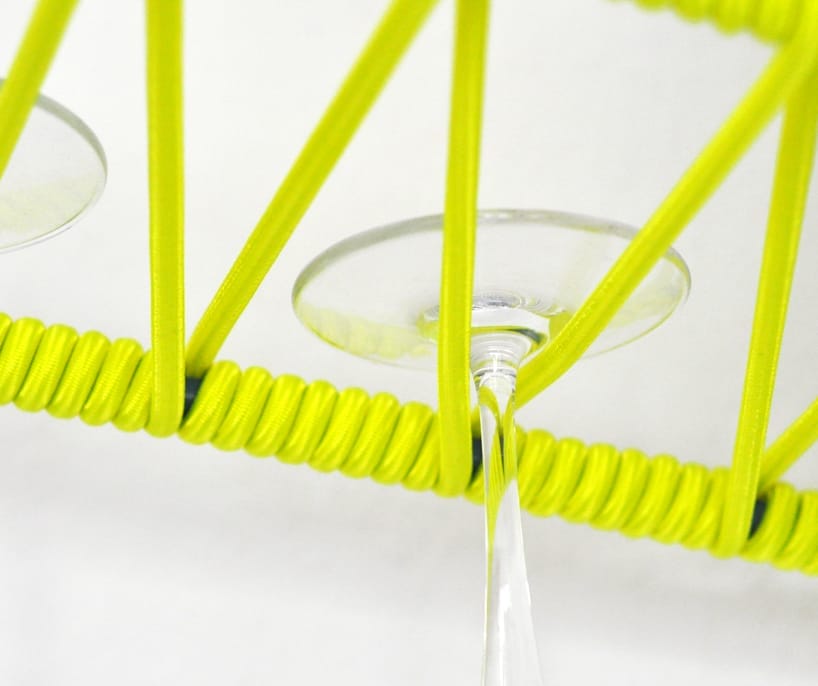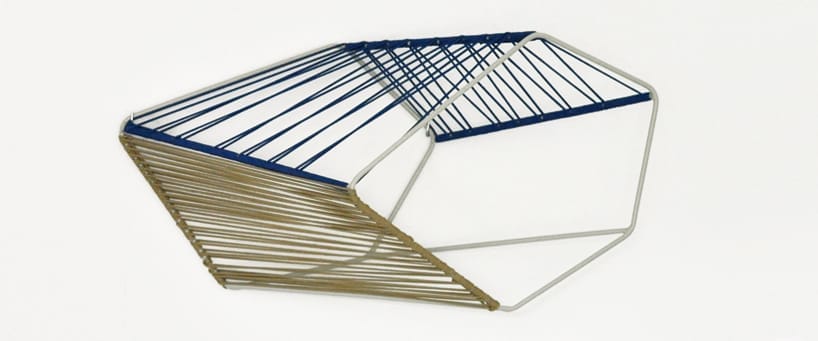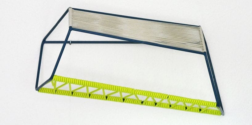 Mediante figuras de volumen hexagonales y pentagonales estructuras rectangulares que se tuercen y doblan consigue crear una estantería con correas de goma tejidas alrededor de la estructura de acero principal que logran esa tridimensionalidad cuadrada.