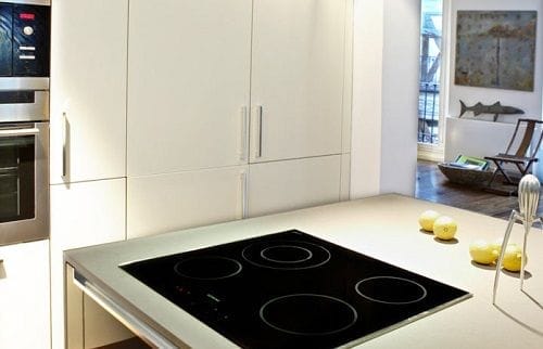 Se aplica el concepto americano de espacio abierto para sacar el máximo partido a los metros cuadrados de los que dispone el apartamento. Llama especialmente la atención la unión entre el salón y la cocina; esta última con una isla central en tonos metalizados que contrastan con la pureza del blanco.