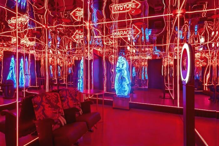 Gran barra iluminada con taburetes del Bam Karaoke Box en Madrid