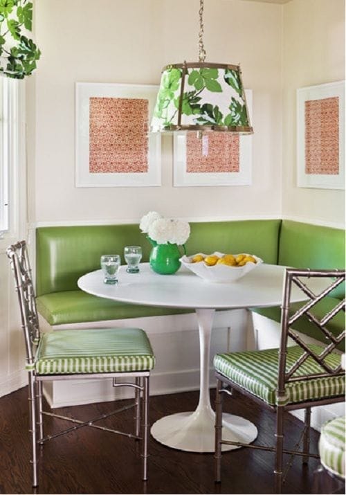 Si tenemos la suerte de tener una cocina de grandes dimensiones, lo más frecuente es poner bancos a ambos lados. Sin embargo, lo más habitual es encontrarlos combinados con sillas de un tono más oscuro. Y si queréis obtener un plus en cuanto a la decoración, escoger los cojines de las sillas a juego con el de los bancos será la solución.