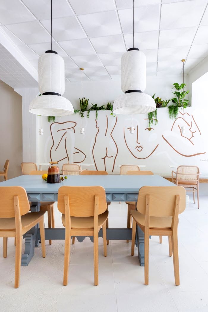 En ambos laterales dos enormes murales de Studio Fi, creados por Koral Antolín. «Queríamos algo especial en esas paredes y no se nos ocurrió nada mejor que esos cuerpos desnudos y lineales que derrochan sensualidad en una línea. Frente a estos, una lámpara por mesa (diseño nuestro). Lámparas que en realidad nacieron siendo vajilla pero decidieron iluminar con su presencia. Para el centro de la sala, Sobre una mesa muy castellana que mudó a azul, dos lamparas muy japonesas de Jaime Hayón. Y sobre la industrial mesa del fondo, un globo papel de HAY corona con luz», resalta Kando.