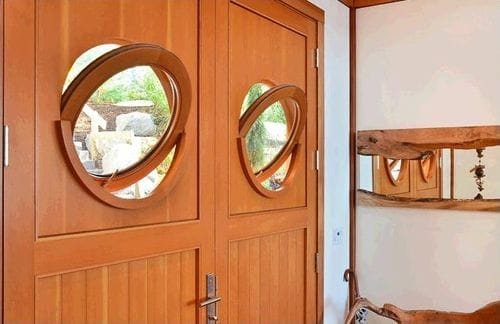 El exterior de la casa está realizado completamente con madera de abeto, cuidando todos los detalles y evitando trabajar con partes de la madera muy susceptibles a la climatología y al paso del tiempo. Debido a que no hay muchas ventanas que puedan abrirse en la fachada frontal, la puerta principal está dotada de unos ojos de buey abatibles, ideales para la ventilación.