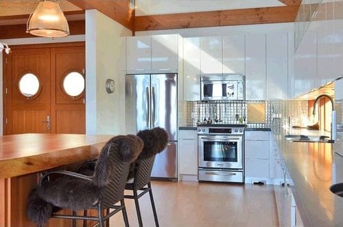 La cocina se encuentra en la planta principal. Cuenta con una pared de azulejos blancos y electrodomésticos de acero inoxidable que encajan bien dentro de este hogar.