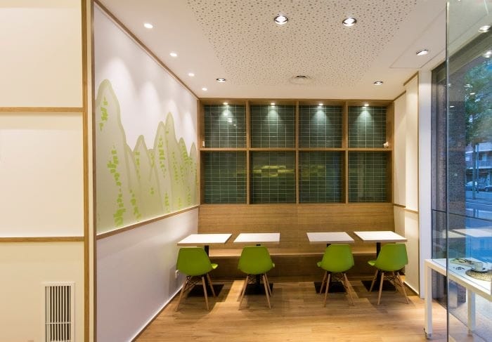 En el interior, se combinaron varios tipos de materiales. Para la zona de degustación y pared expositora la madera de roble tintada y el lacado blanco para paredes y expositores. Mármol blanco para la barra y la cerámica verde como color corporativo en la contra barra y zona de bar.