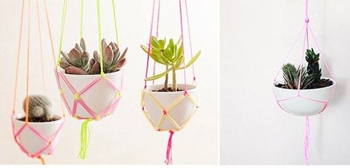Utilizar colgados de macramé como portamacetas no hará sino reforzar el elemento boho chic de nuestra decoración, ya que el uso de plantas es una de sus bases. Colgados de las paredes o, sobre todo, del techo, son originales y una forma fácil de integrar elementos verdes en nuestros interiores. Se puede colocar en su interior, además de una maceta, una botella de cristal o incluso una pecera, que puede contener plantas colgantes, flores cortadas, piedras, terrarios, velas…