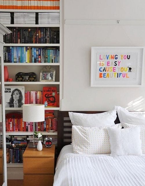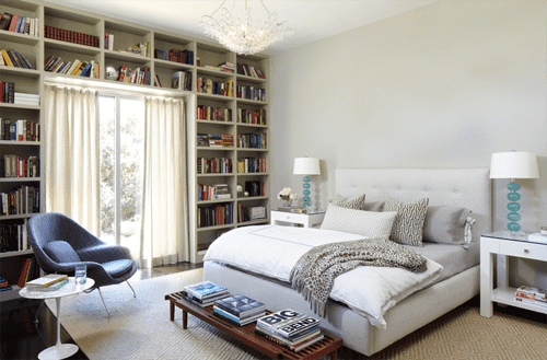 Para los que prefieren crear una biblioteca como las de siempre, se pueden colocar las estanterías en el lateral del dormitorio, como se ve en las imágenes.
