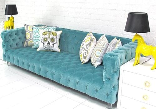 También podemos hacer uso del terciopelo como acento en un espacio, es decir, incorporar algún mobiliario en terciopelo que posea un color llamativo con respecto a los colores que tiene ese espacio, para que así de un toque diferente y exótico a la zona. Vemos en los diferentes casos como con este aporte se ha alterado el cromatismo del lugar, creando nuevas impresiones muy agradables.