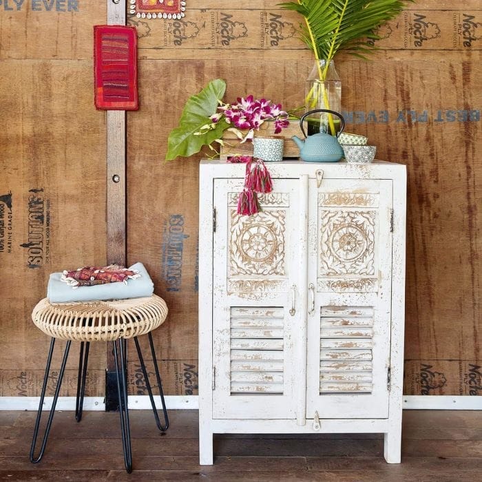 Esta vitrina es de inspiración exótica, te llevará de viaje dentro de tu propio comedor. La pureza y la ligereza de sus cuadrados de vidrio templado contrastan elegantemente con su estructura majestuosa delicadamente blanqueada, envejecida y encerada. El contorno de las puertas está esculpido a mano para ofrecerte un mueble único.