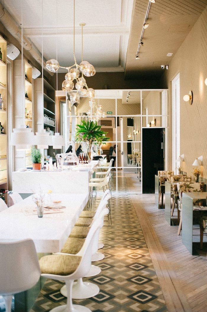 Podría denominarse un lugar con encanto donde hay un largo recorrido marcado por la luminosidad que aportan sus grandes ventanales y la altura de sus techos. Sumado al color blanco de sus paredes, los estampados de su mobiliario, además de las flores frescas que inundan el local.