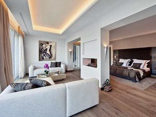 El lado más Kitsch lo encontramos en uno de los dormitorios donde los textiles, tanto la colcha como los juegos de cojines, se visten con print de leopardo. Abundan también las obras de corte contemporáneo y los materiales naturales. Pero sin duda lo que más llama la atención es la integración de la tecnología en paredes y techos. Las múltiples televisiones, la iluminación o los aparatos de aire pasan totalmente desapercibidos.