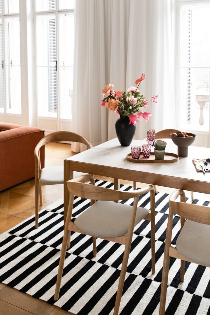 Como se puede comprobar a continuación, la selección de alfombras y cojines de esta colección están elaborados con diferentes materiales y la paleta de colores no es muy reducida. Sin embargo, quizás no a simple vista, pero entre sí se puede crear un contraste divertido que sin duda le dará un toque muy original a tu hogar. Estudia la paleta de colores que quieres para tu casa y experimenta combinando con los textiles. A continuación exponemos algunos ejemplos pero en la web de Westwing dispones de muchos más.