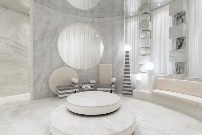 El espacio diseñado para Roca nace de una evocadora lectura del orden arquitectónico clásico, con una distribución estratégica de los diferentes elementos que te envolverán por completo en la estancia. Esferas, cilindros, conos, cubos y prismas se funden en columnas policromáticas alrededor del espacio central. Los espejos y cortinas refuerzan la atmósfera etérea diseñada para este espacio, con un toque irreal y fantástico que hará que quien entre en la habitación olvide dónde se encuentra.