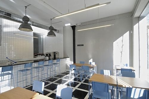 El local, ubicado en la esquina en la que se cruzan las calles María de Guzmán y Ponzano, es de estilo industrial: paredes revestidas de azulejos blancos, suelo de mármol negros y columnas de ultramarinos del local original, grandes lámparas importadas de Alemania, una gran barra también de azulejo blanco y una docena de mesas individuales. El interiorismo ha sido diseñado por Marcelo Burgos y el toque de color lo aportan las sillas y taburetes de hierro de la firma belga New Duivendrecht, pintadas de azul celeste.