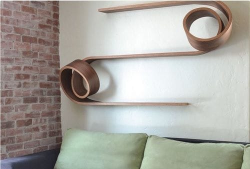 5. Estantería modernista. Esta otra recupera el paralelismo entre las baldas, pero su acabado es sorprendente. Giros realizados por la superficie de la propia estantería crea un efecto donde se destaca el relieve de la propia pieza.