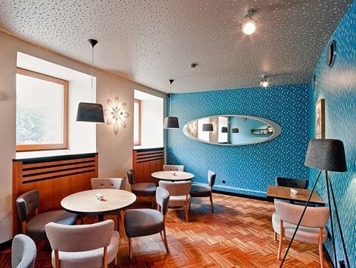 Este bar y restaurante recupera esta época con una decoración retro muy colorida. El papel pintado en color azul se combina con objetos en tonos dorados y blancos. Y aunque parece que meterse en el Zig Zag es meterse en una máquina del tiempo donde predomina lo analógico, este local sí hace uso de las nuevas tecnologías. El techo está insonorizado para que los DJs consigan una buena acústica sin ecos. El suelo es de parquet de madera suave y elegante.